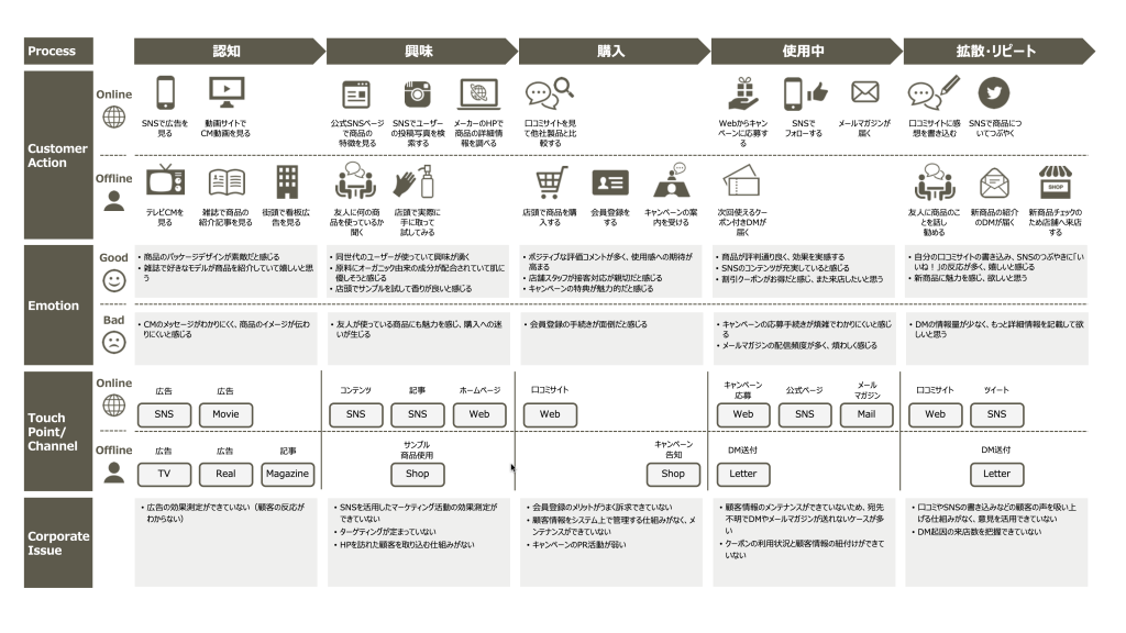 各段階での詳細な行動と、そのときどきどんなタッチポイント(接点)に触れているのかを書き出します。